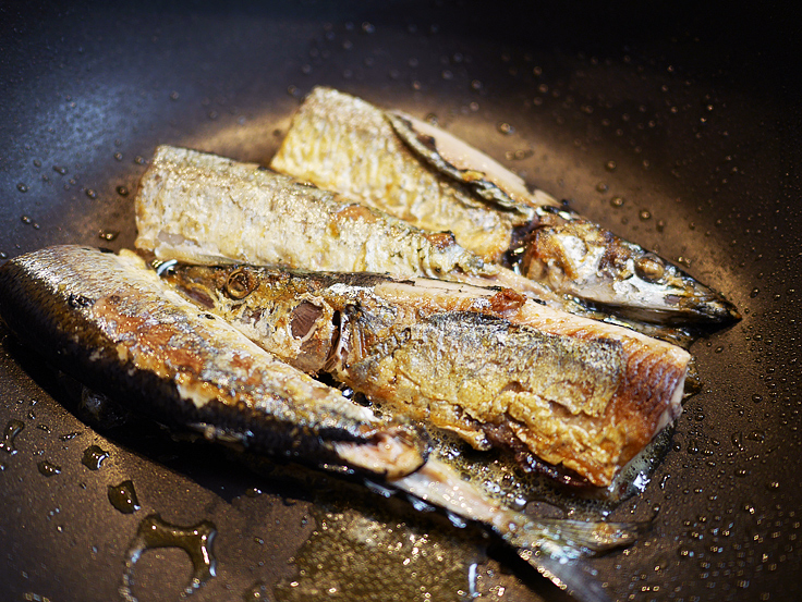 (3)塩をふったさんまを、油をうすくひいたフライパンで焼く。表面に焼き色がつく程度でOK。中までしっかり火が通っていなくて良し! 多少崩れても気にしない! 脂が飛ぶのでフタをしながら焼いて良し!