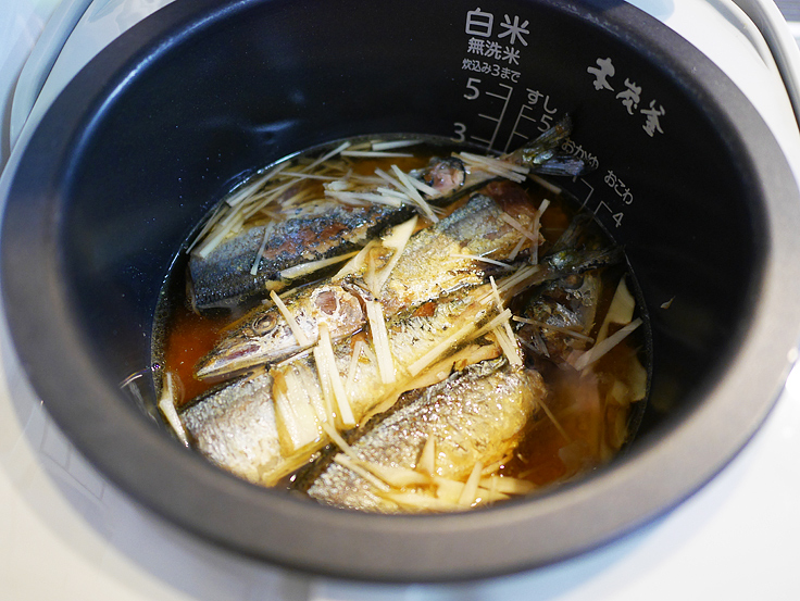 (4)炊飯器の釜に米、しょうゆ、酒、みりんを入れ、2合のラインまで水を加える。その上にさんまを乗せ、しょうがの半分を散らしてフタをし、普通コースで炊く。