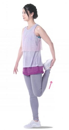 立った状態で左脚の膝を曲げ、左手で爪先を持つ。この状態を10秒続ける。同じように右足も行う。