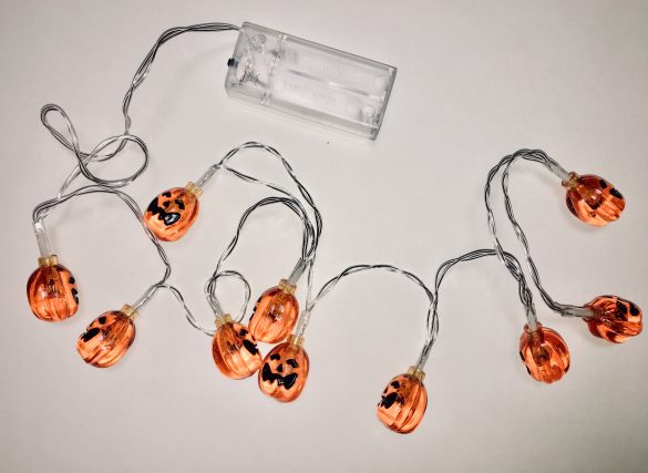 最後に紹介するのがLEDが光るカボチャガーランド。ひもにオブジェを取り付けて、室内の飾りにしたものをガーランドと言います。誕生パーティーなどで三角の旗がついたガーランドがよく飾られていたりしますよね。サリュで買ったこのガーランドはそれぞれのカボチャたちが光るので、夜のパーティーにもぴったりの飾りです。単3電池2本で使用できるので、イルミネーションとして夜のベランダに飾れば「トリックオアトリート!」と思わず言いたくなりそうな商品です。