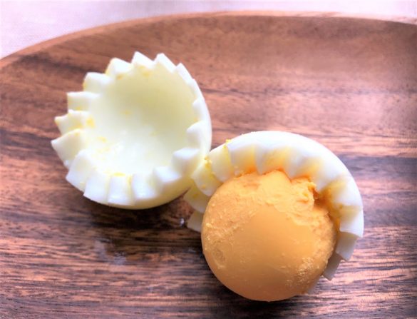 続いては、包丁では難しい茹で卵の飾り切りができる「花卵コロン」。飾り切りというと、包丁の刃先を細かく慎重に動かしていかなくてはいけないため、不器用さんにとっては至難の業。