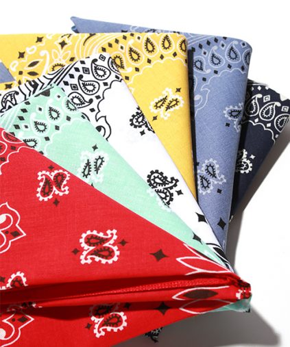 では、バンダナの選び方です。多くの人はごく普通のコットンのバンダナを1度ぐらいは買ったことがあるのではないかと思います。量販店で簡単に手に入る、大判のハンカチです。 しかし誰でも、あれがそれほどおしゃれなものだとは思わないでしょう。 ごく普通の簡単に手に入るバンダナを、よりおしゃれで、モードなものにするにはどうしたらいいでしょうか。