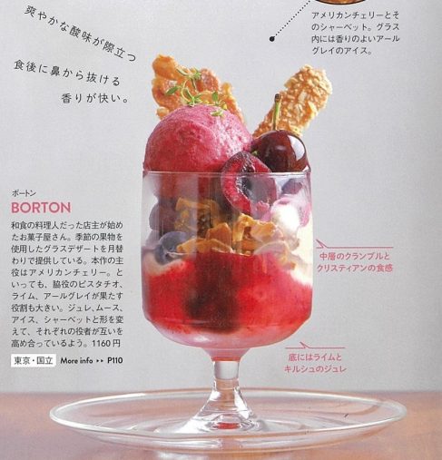 たとえば東京は国立にある「ボートン」の「アメリカンチェリーのグラスデザート」は、アメリカンチェリーとそのシャーベットを上に、中にはアールグレイのアイスを投入。想像するに、フルーツの甘味と酸味をアールグレイの心地よい渋みで調和されるよう。中層にはクランブル、底にはライムとキルシュのジュレと、食感と香りにも妥協を許さない姿勢がうかがえます。