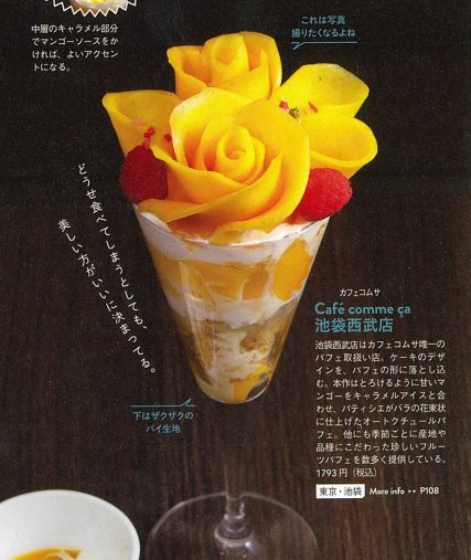 昨今の「体験型パフェ」は本書いわく「アトラクションパフェ」。東京の池袋西武デパートにある「カフェコムサ」。こちらの「マンゴーローズブーケのパフェ」は、薔薇の花に見立てたマンゴーの上に、お客さんが自らキャラメルソースをかけて食べるというスタイル。もちろん別々に食べてもOKですし、味わい方は自由です。