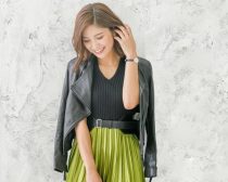まずおすすめしたいのが、キレイ色のスカートとブラックライダースジャケットの組み合わせ。インナーやシューズもブラックで統一することで、スカートの鮮やかな色が際立ちオシャレ度UP。スカートはミモレ丈のプリーツで、ふんわり広がるAラインがフェミニンな印象に。一点キレイ色投入×ライダースジャケットで洗練された大人レディコーデを楽しんで♪
