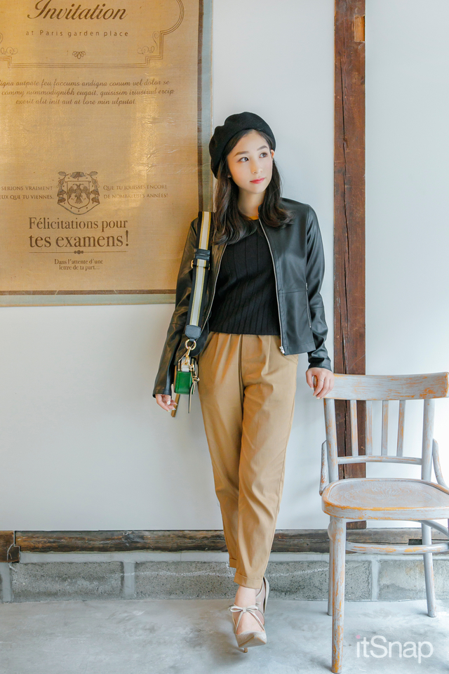 ライダースジャケットをパンツスタイルでオシャレに着こなしたこちらのコーデ。シルエットがきれいなチノパンツに女度高めのパンプスを合わせているのがポイント。ボトムはウエスト部分にタックが入っていたり、アンクル丈で足首が少し見えるものを選ぶことでスッキリとバランスよくまとまります。さらにボトムとシューズの色を揃えれば脚長効果でスタイルアップも♪