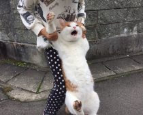 ツイッターでバズった写真は、朝から脱走し、なかなか帰ってこない茶色さんを探した後につかまえた瞬間をおさえたもの。「#捕獲萌え」と添えられたハッシュタグのとおり、「離してくだされ~」と叫んでるかのような、なんとも絶妙にユーモラスな顔の表情と、取り押さえられつつも歌舞伎の見得を切るかのように手足を振り上げる勢いのある茶色さんに、萌えた人も多かったのでは?
