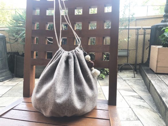 「1ヶ月ほど前に自分で作った巾着バッグです。カラーや素材、革ひもの色まで全て自分好みに仕上げました。温かみのあるウール素材なので秋冬コーデにぴったり。アクセントとしてRUNIというブランドのキーホルダーをつけています」