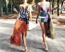 どれも巨大、しかも長いフリンジ付きなので、背の高いランウェイモデルたちでも引きずりそうなサイズが目を引きました。