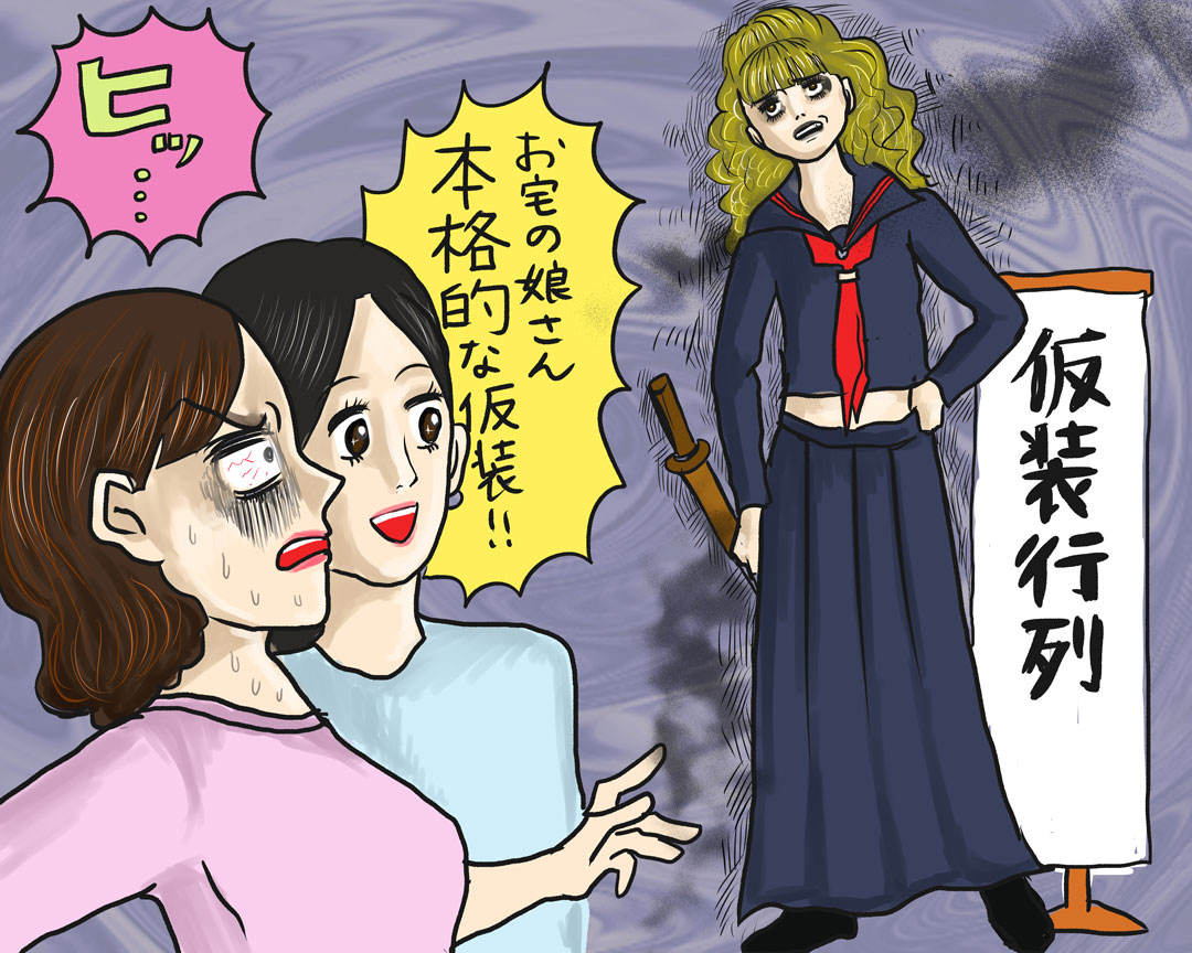 おそらく、ほとんどの読者の方は想像がついていると思いますが、仮装行列で奈々枝さんの娘さんが披露したのはロングスカートのセーラー服姿という昔の不良少女。茶髪ロングヘアのウィッグを着用し、濃いめのメイクはヤンキー時代の彼女にウリふたつでした。