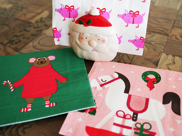 フライングタイガー ペーパーナプキン オシャレかわいいデザインに定評あるフライングタイガーの世界観を手軽に楽しめるのがコレ。クリスマス柄だけでも豊富なバリエーションがあり、何種類かまとめて揃えれば、モノトーンな食卓が一気に華やぎます。ナプキンスタンドのほのぼの感も絶妙!
