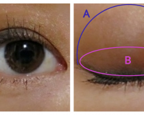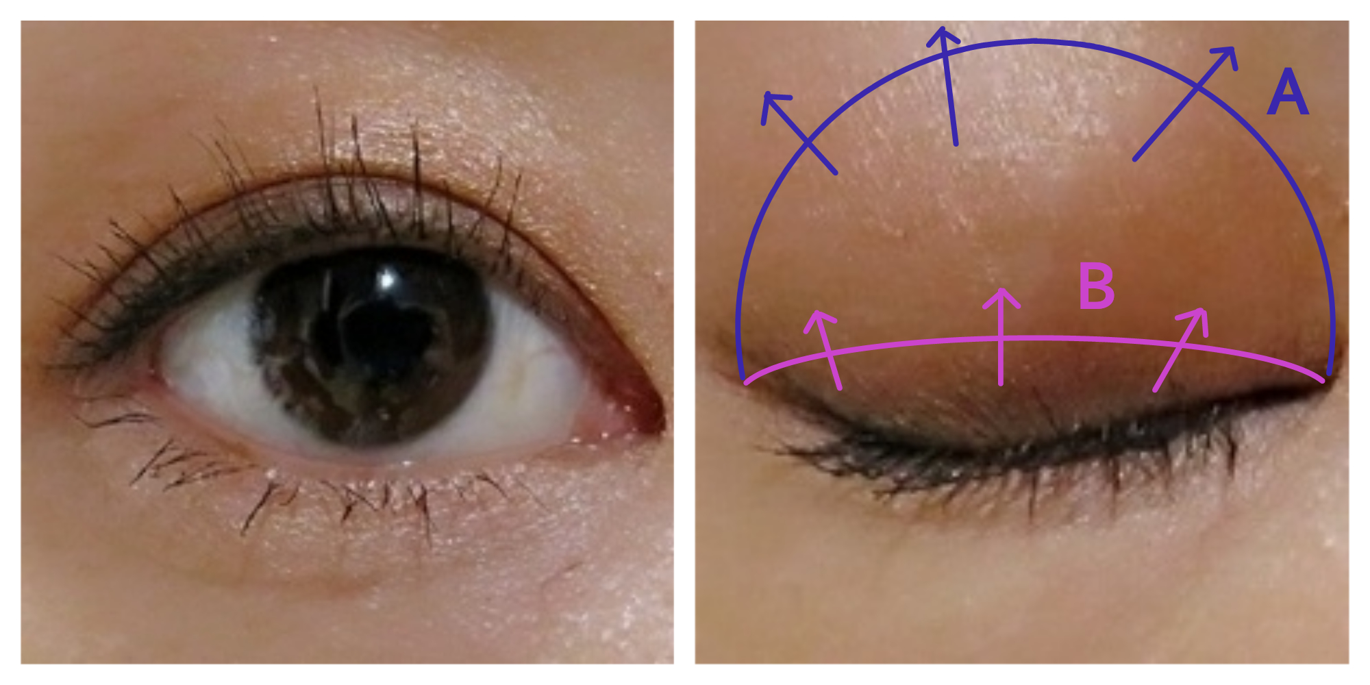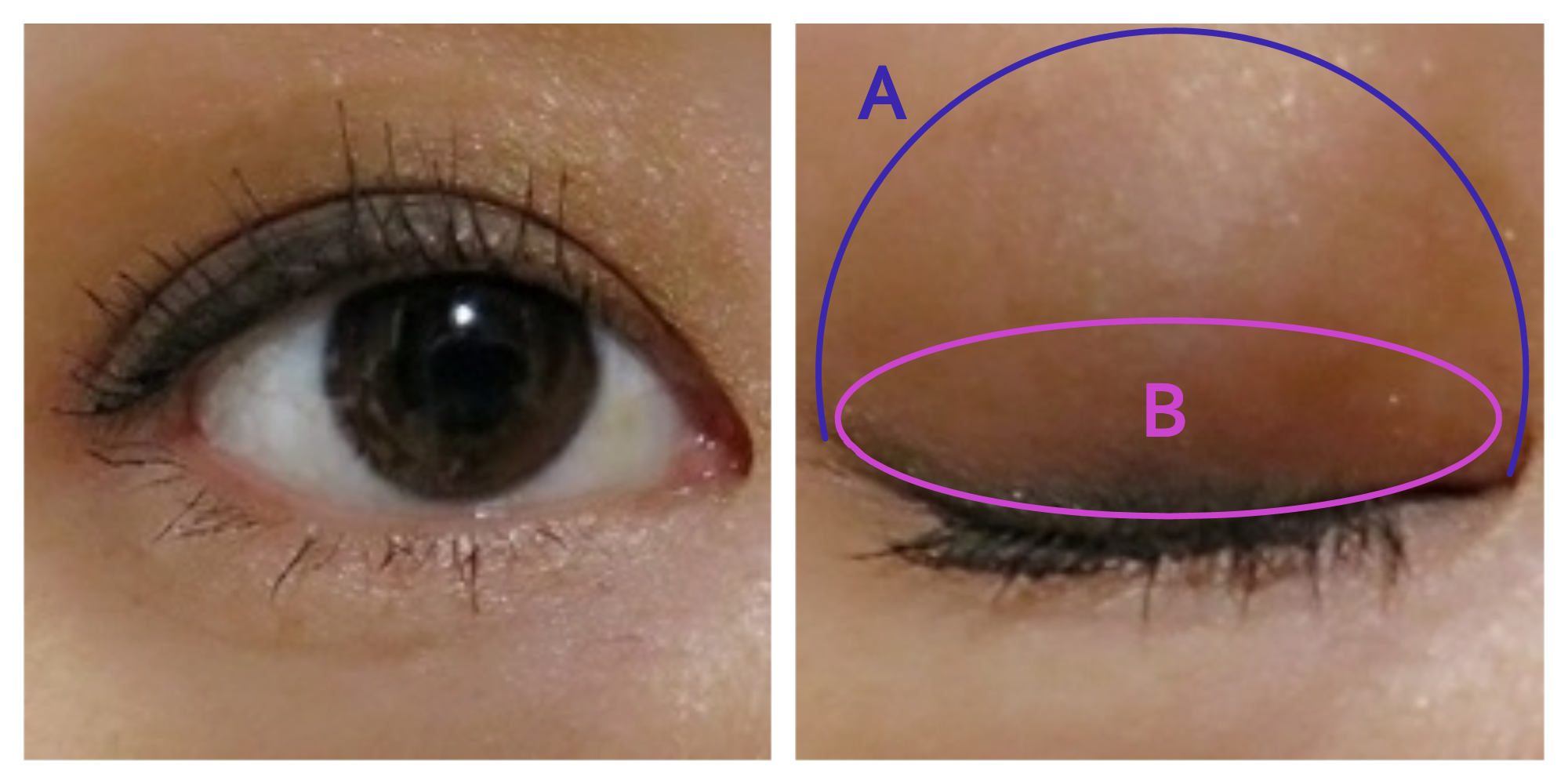 アイホール全体(写真A部分)に濃いめブラウンを塗り、さらに濃いブラウンを二重幅(B部分)に乗せています。全体的にボカしていないので、ボテッとした印象になっています。