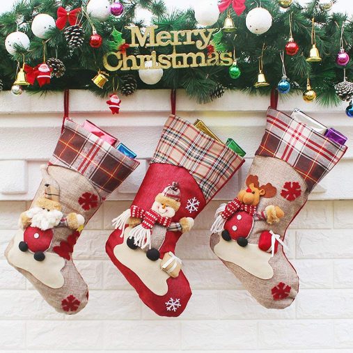 「Aitey Christmas Stocking, 18″ Set of 3 Santa, Snowman, Reindeer, Xmas Character 3D Plush with Faux Fur Cuff Christmas Decorations and Party Accessory (Short Hat2)」$17.99 アマゾン・ドット・コム販売ページより