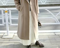 ロングスカートの上に何を羽織るかというときに、ショート丈を合わせるのがバランスがいいと多くのスタイリングの教科書には書いてあるでしょうけれども、全体をビッグシルエットにしたい今なら、こんなふうにミドル丈またはロング丈のコートの下からスカートの裾が出ても全く問題ありません。