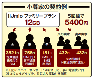 小暮氏が契約しているのは、12GBのデータを最大10枚のSIMカードでシェアできるIIJmioのファミリープラン。小暮氏の一家と、夫妻それぞれの実家の3世帯5回線でシェア。月々の料金は5000円台前半。