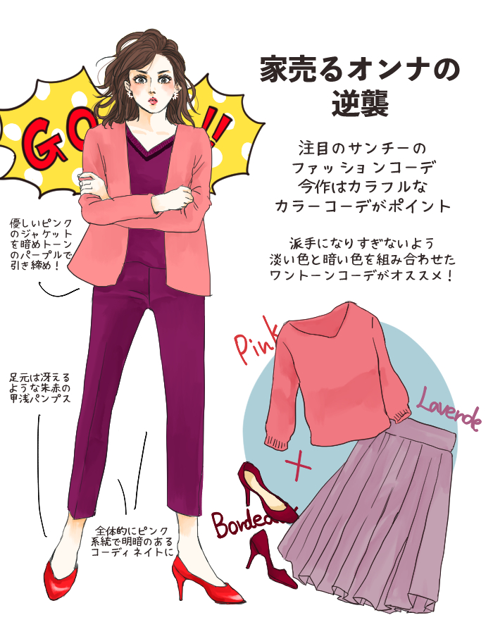 衣装スタイリストさんの計らいでしょうか、ピンクは2019年春夏のトレンドカラーにピックアップされています。また、今回のサンチーらしいファッションのポイントは同系色のワントーンでまとめるコーディネイトです。ピンクと近い属性を持つ紫で濃淡コーディネイトをしていたり、赤のコートに赤のジャケットを合わせたワントーンでまとめたり、遊び心があります。人物相関図、更新しました🏠