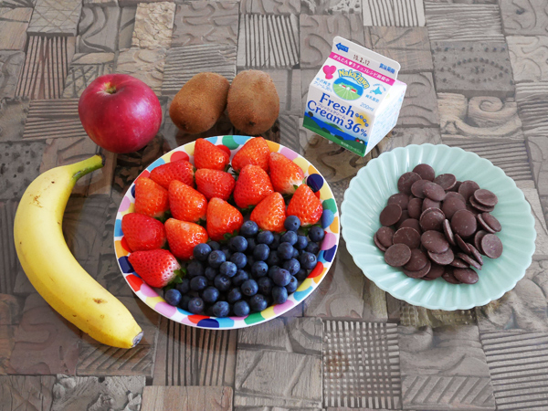用意するのは、お好みの果物、製菓用チョコ(ミルク)100~150g、生クリーム100~200ml。