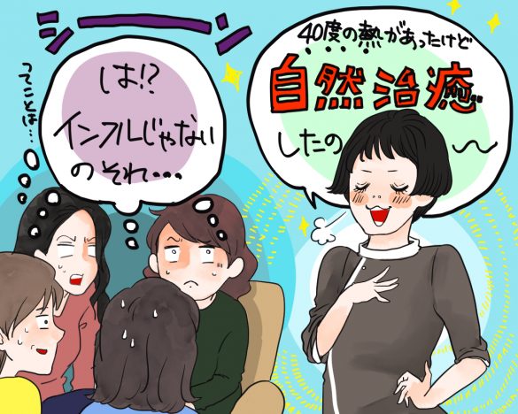 「『私も久しぶりに体調を崩してたんだけど、40度の熱を出してデトックスして病院に行かず治したの!』と……。みんな『え? この時期に40度ってインフルじゃね!?』と瞬時に思ったようで、無言で目くばせ。