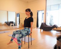 床に座って前屈をしてもよいし、椅子に座って足の裏にゴムチューブをかけて床から持ち上げてもよいです(左右それぞれ90秒以上キープ)。