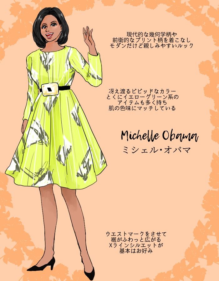 「着飾らない、ハイブランドで身を固めない、それでいて自分に似合う服」というテーマを掲げるミシェル夫人のファッションスタイルは多くの現代女性のなりたい未来像と共鳴していたのでしょう。ミシェル夫人によく似合う、カラフルな色使いのワンピースやドレスは非常にファッショナブルで真似したいポイント。見ているだけで元気が出てくるようなパワーを感じさせます。