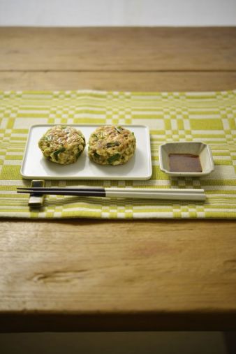 2. フライパンを熱し、小判型にまとめた1を両面焼く。からし酢じょうゆを添えていただく。