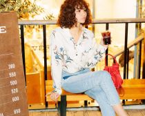 大振りの花柄シャツにスキニーパンツを合わせた、90年代のLAガール風デニムコーデ。フェミニンな印象の花柄も、柄の大きさとカラーを選べばかっこよく着こなせるんです。しかもこのシャツ、肌ざわりがよく、ほどよいとろみ感があるから女っぽさもUP。ヴィヴィッドな赤のバッグとカラフルなパンプスで色を差して、こなれ感も強調して。