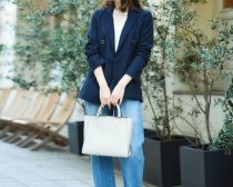 つまりこういうことです。このハイライズワイドレッグジーンズをはくときは、ジーンズでもきれい目、しかもゴージャスでいこうということです。 ジーンズをあたかもセンタープレスの入ったリネンのパンツのように扱って、フェミニンで、ゴージャスな装いをする。日本語で言えばおめかしジーンズといったところでしょうか。