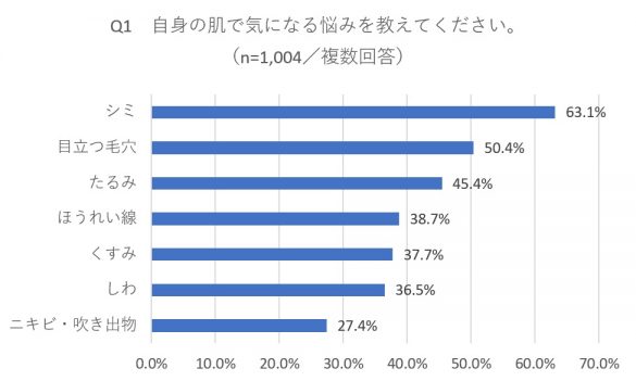 20代~60代の女性1,004人を対象に、株式会社サンシャインコーポレーションがグノシーを通じて行った「スキンケアに関するアンケート」によると、自身の肌の悩みで最も多かったのは「シミ」63.1%。次いで「毛穴」50.4%が挙がっています。