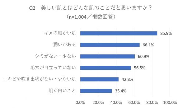 また、「美しい肌とはどんな肌か」という質問に対しては、85.9%もの人が「キメの細かい肌」と回答。次に多かったのは「潤いがある」66.1%、「シミがない・少ない」60.9%でした。