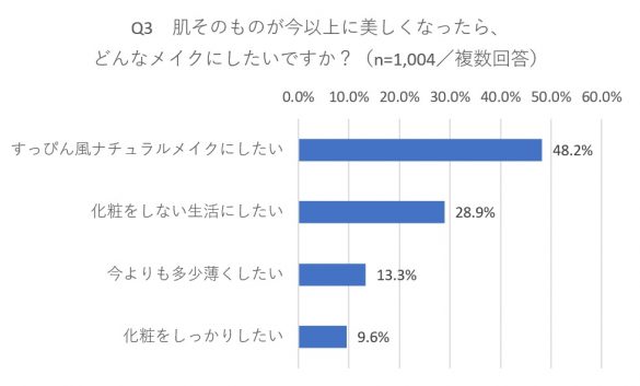 「肌そのものが今以上に美しくなったら、どんなメイクにしたいですか?」という問いには、実に半数近く(48.2%)の人が「すっぴん風ナチュラルメイク」と回答。