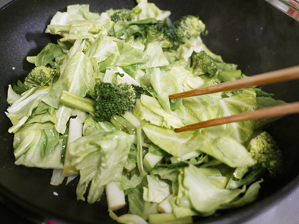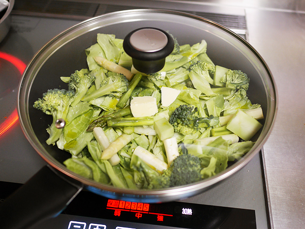 (1)洗って適当な大きさに切った野菜を、フライパンの中に入れる。上から水(もしくはだし汁)を100mlほど回し入れ、塩をふる。さらにオリーブオイルを軽く回し入れる。風味をアップさせたい場合は、バターを少々乗せる。