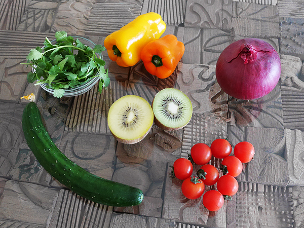 まずは、レインボーソースに使う食材の紹介から。意識すべきは、「色とりどりであること」。赤、黄色、オレンジ、緑、紫を意識しながら、楽しく食材を集めましょう。必ずコレ、というわけではありませんから、ありもの野菜を使ったり、好みに応じてアレンジしてもOKです。