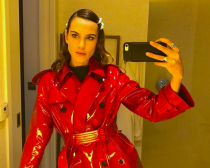 モデルでファッションデザイナーのアレクサ・チャンは、前髪をサイドパートにしてイミテーションパールが付いたバレッタを重ね付け。90’sムービーに出てきそうなスパイファッションとマッチしていますね。