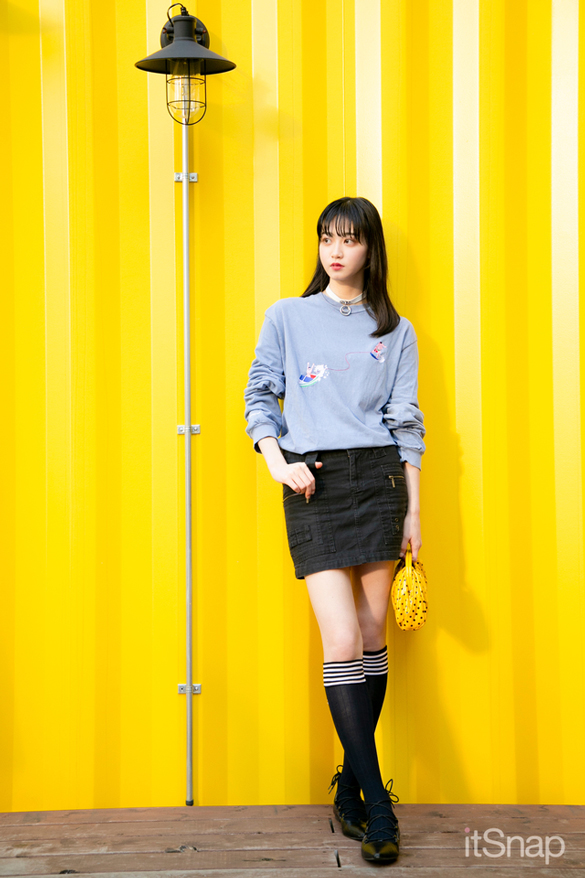 タイトなデニムミニスカートに、ラベンダーカラーのロングTシャツを合わせたレトロなワンツーコーデ。ガーリーになりがちなミニスカートも、デニムならアクティブな印象に! 脚見せも、レースアップシューズとハイソックスでほんのりスポーティー要素を取り入れれば、ヘルシーに仕上がります。