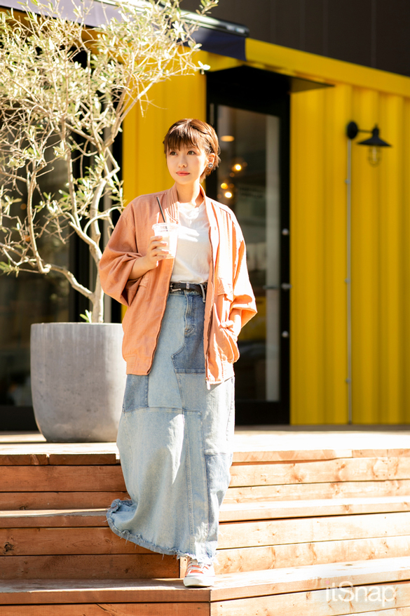 ロングスカートにビックサイズのブルゾンを合わせたリラクシーコーデ。ゆる×ゆるなシルエットも、薄色デニムとピンクなら女の子らしさもしっかりキープできます。パッチワーク調のデザインがかわいいロングスカートは、取り入れるだけでたちまちおしゃれに。