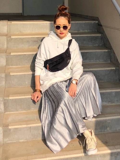 今年の春夏も引き続き、ビッグシルエット・オーバーサイズのパーカーやスウェットが根強い人気を出していますし、90’sスタイルに合わせてボトムもダボっとしたアイテムを取り入れている若者も多いですね。しかしアラサー&アラフォー女性は、メリハリをつけることが大事です。なので、ビッグサイズのパーカーを合わせる際は、すっきりとしたスキニーのブラックパンツや、細身のストレッチスカートにレギンスといったコンパクトなボトムを選びましょう。
