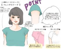 この時、間違って二の腕にピッタリとフィットしたデザインを選んだり、大きなフリルデザインがほどこされているアイテムを選んだりしやすいですので気をつけましょう。フリルが大きすぎると今度は肩幅が広く上半身がガッチリして見え、着太りを起こしやすくなります。また、二の腕にピッタリとフィットした袖を選んでしまうと、二の腕の大きさが目立つのでこちらも注意してください。