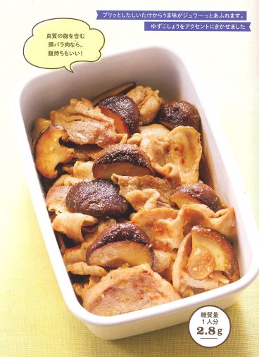 1人分の糖質量が2.8g、冷蔵保存は4~5日です。私にとってしいたけってかなり上級食材だったのですが、まさか豚バラ肉とベストマッチするとは意外でした。ゆずこしょうがきいているので、豚肉の脂がうまく調和されています。
