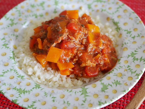 (3)カリフラワーライスの上に煮込んだソースを乗せれば完成。