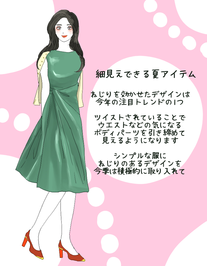 夏にオススメの楽チンでオシャレに見えるコーディネイトとして今夏オススメするのは「ひねり」を効かせたデザインアイテム。トップス、スカート、ワンピースなどに多くみられるデザインなのですが絞りがあることでウエストがキュッと引き締まって見えスタイルアップにつながる優秀アイテムなのです。