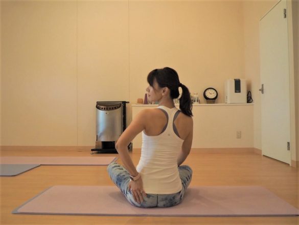 右の臀部が気持ちよく伸びているのを感じましょう。反対側も同様におこないます。