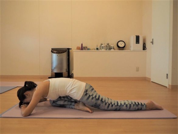 (2)手と手の間に右ひざをつく。左足を真っすぐうしろに伸ばしたら両手を体の前につき、手のひらを重ねた上に額を乗せて90秒以上キープ