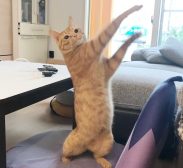 「今からヒーローに変身するんですか?」とツッコミたくなるこの1枚は、ねこじゃらしと戯れる愛猫・レオンをとらえたもの。左右におもちゃを振りながらスマートフォンで連写をしていた時、偶然に撮れたレアショットです。猫背はどこにいったのかと思ってしまうほど見事な2足立ち姿やピーンと伸ばされたおててからは、ねこじゃらしに対する熱い情熱も伝わってきます。