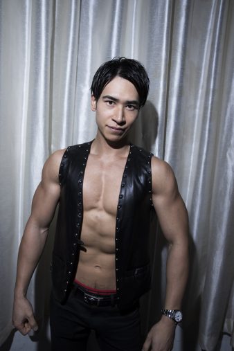 メンバー1の高身長であるRIKUは爽やかな笑顔がウリ。A Mens Tokyo加入歴は8か月。「ここ最近の話ですけど、オフの日はヨガを始めました。ジムでのトレーニングもそうですが、ヨガをやってると無心になれるのがイイんですよね。ステージ上では僕の笑顔と筋肉を楽しんでもらえたら」