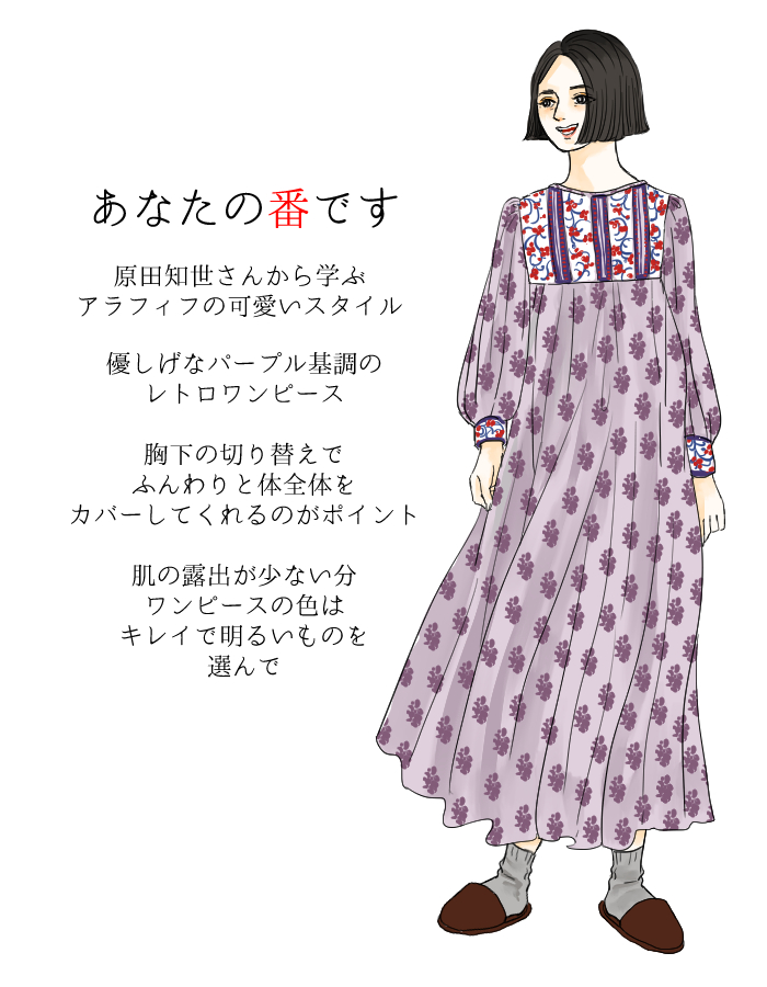 原田知世さんは肌の色も白いので、優しいラベンダー系の色合いがよく似合っています。50代前後になると淡い色や可愛い柄に少し抵抗を感じるかもしれませんが、アラフィフこそこうした優しい色に挑戦してみられると良さそうです。