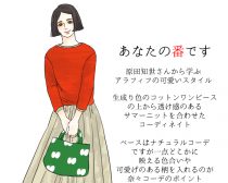 原田知世さんにならう50代ファッションのポイントは、肌のトーンが明るくなるようなキレイ色を取り入れること。そしてアクセントとなるよう大きめな柄アイテムをコーディネイトのどこかに1点入れてみることにも挑戦してみてくださいね。