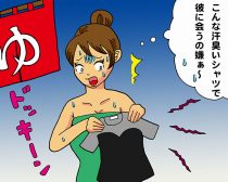 さっき脱いだシャツがめちゃくちゃ汗くさくてあせる夏希さん。もちろんバーの帰りに急きょ銭湯に来たので着替えなんて持っていません。