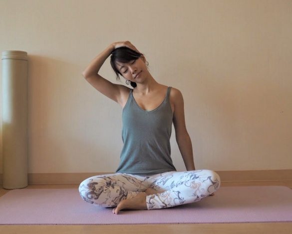 2. 右手を左側頭部に添え、頭を右側に倒し呼吸を5回