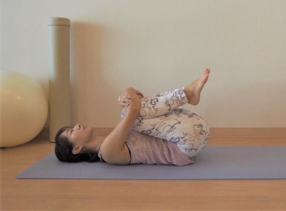 ヨガの「ガス抜きのポーズ」は、仰向けの姿勢から両ひざを曲げて胸の前に引き寄せることで、自分の足の重さを使って腹部に軽く圧をかけることができます。そうすることで腸が刺激を受けて、お腹からガスを出しやすくすると言われているのです。