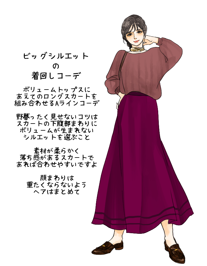 ビッグシルエットトップスの着回し成功のポイントは、ボトムシルエットにスタイル変化をつけることです。基本的にはトップスがゆったりしているので、ボトムはスッキリ見せることが大切ですが、落ち感のあるロングスカートを合わせるワザも覚えておくと良さそう。秋のオシャレはこれから! ぜひ、さまざまな着こなし方を楽しんでくださいね。
